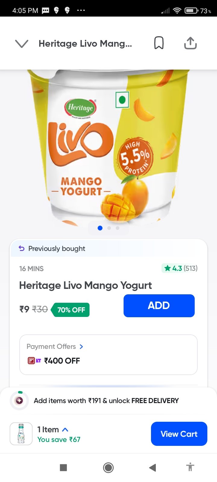 Shop on Swiggy InstamartGet Heritage Yogurt (100g) for just ₹9 on Swiggy Instamart! This is a fantastic 70% discount from its retail price of ₹30. Limited time offer, grab yours now before it expires. Perfect for a healthy and delicious snack.
