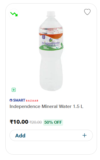 Enjoy a refreshing deal on Independence Mineral Water. Get the 1.5L bottle for only ₹10, down from its retail price of ₹20. That's a massive 50% discount!