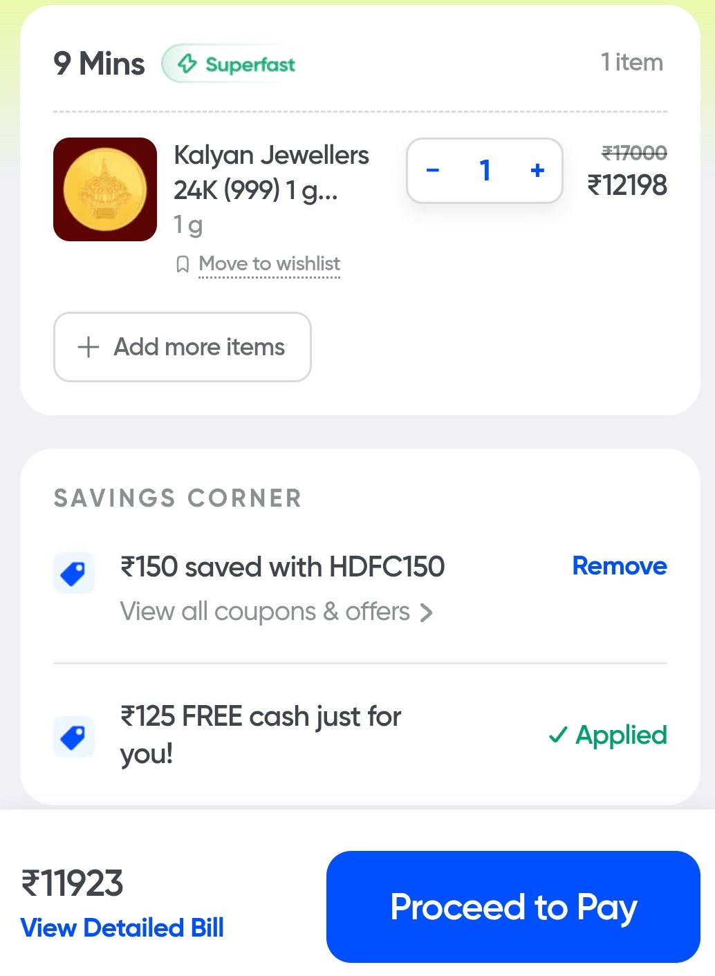 Get a 1 gram Gold Coin from Instamart for just ₹11923! This special offer allows you to save on market price using HDFC Bank cards and available Swiggy Free Cash. Check local availability as stock may be limited.