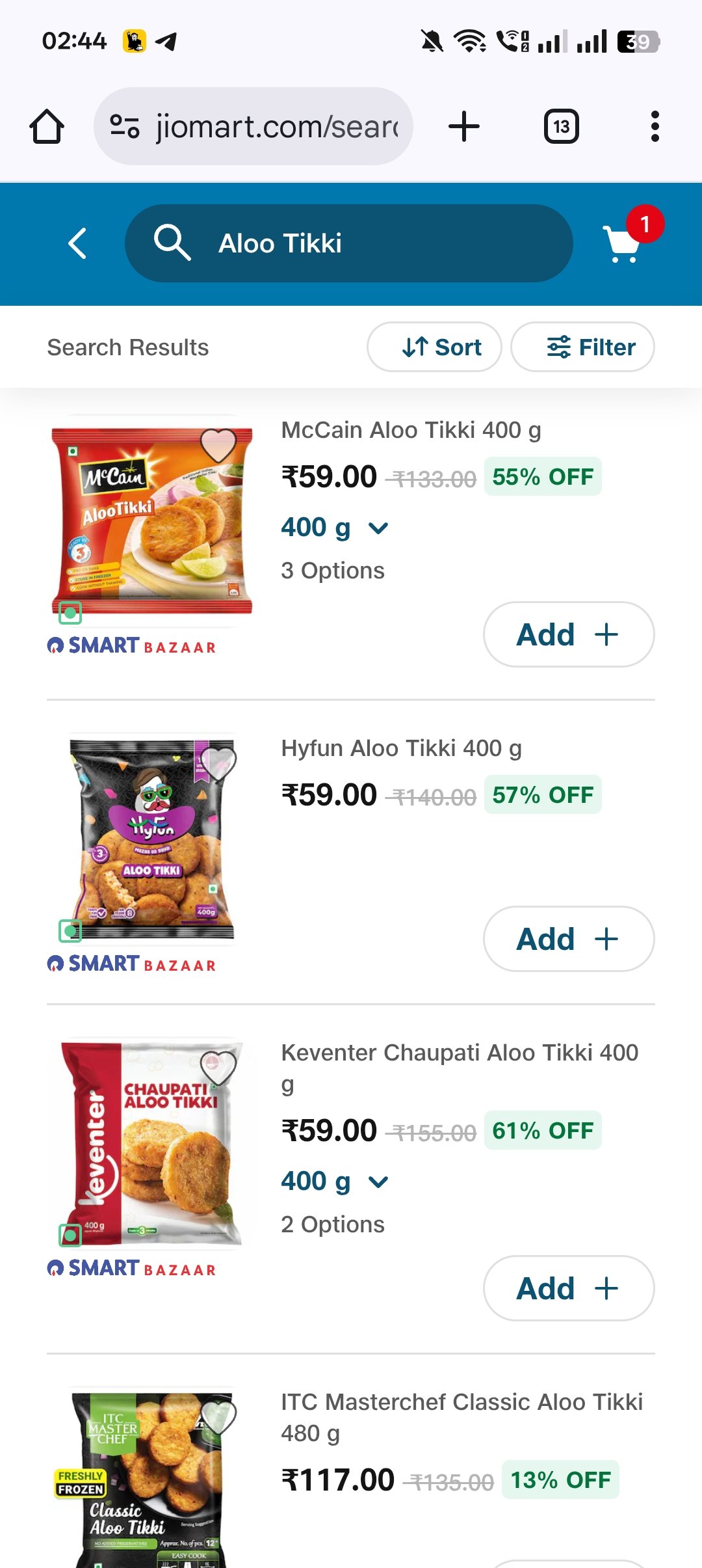 Grab a delicious deal on Aloo Tikki at JioMart! Get the 400gm pack from popular brands like Hyfun, McCain’s, or Keventers for just ₹55, an amazing 59% discount off the retail price of ₹133. Perfect for quick snacks or appetizers. Don’t miss this limited-time offer!
