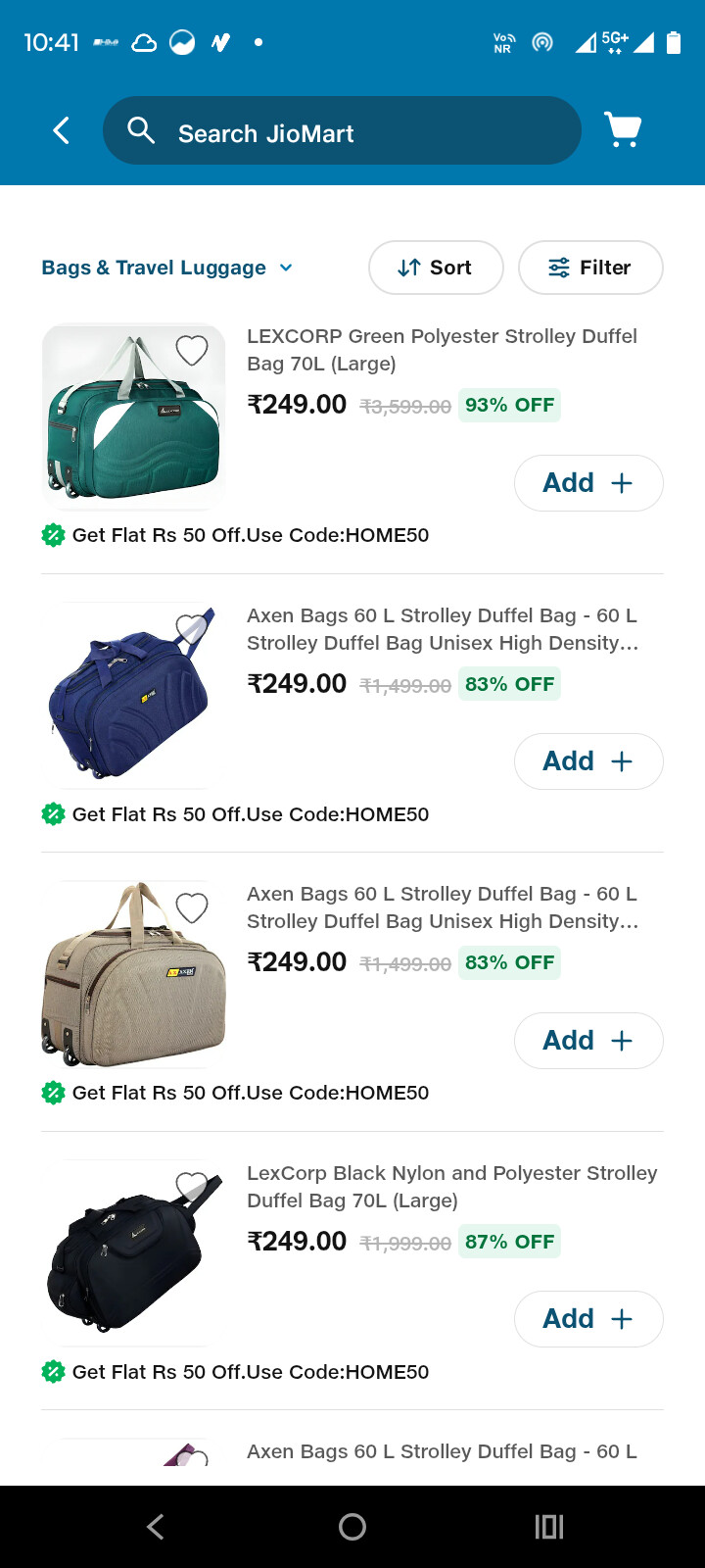 Available on JioMart, explore a wide selection of travel bags and luggage. Prices start from an attractive ₹199, offering durable and stylish options for all your travel needs. Whether you’re planning a short trip or a long vacation, find the perfect bag at an unbeatable price.
