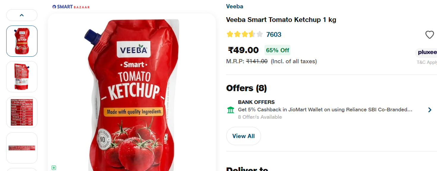 Grab Veeba Smart Tomato Ketchup (1 kg) at a massive 65% discount on JioMart, now available for just ₹49!