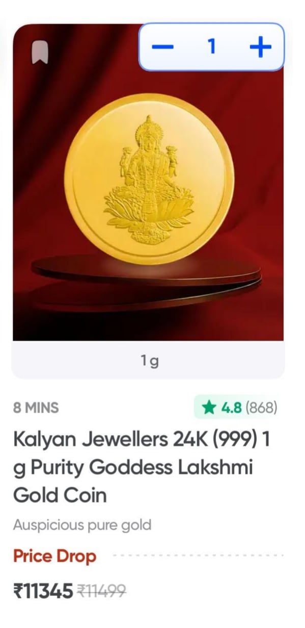 Get a Kalyan Jewellers 1Gm 24K Gold Coin for just ₹10363 on Swiggy Instamart! This exclusive offer is available for specific locations in Coimbatore.