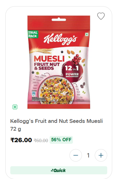 Start your day right with Kellogg’s Fruit & Nut Seeds Muesli. This 72g pack is now available at an incredible 57% discount from its retail price of ₹60, making it an excellent choice for a healthy and delicious breakfast.