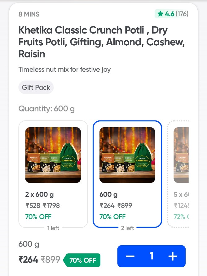 Grab the Khetika Dry Fruits Potli featuring 200g each of premium Almonds, Cashews, and Raisins (total 600g). Avail a massive 71% discount, bringing the price down to just ₹264. This healthy assortment is perfect for snacking or gifting. Find this amazing deal exclusively on Swiggy Instamart.