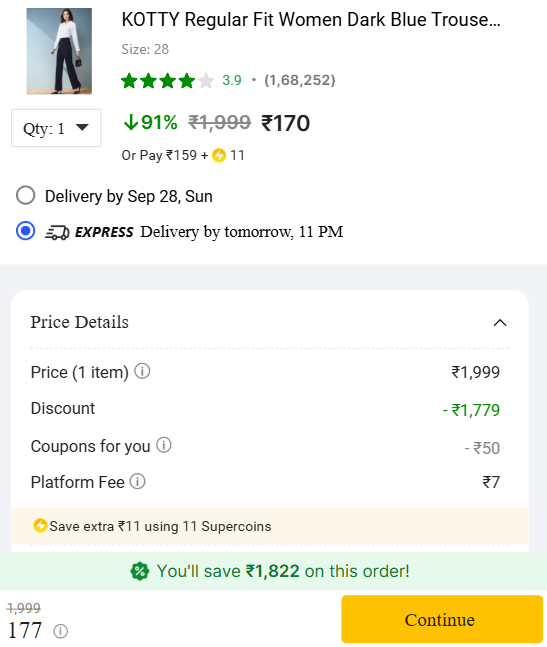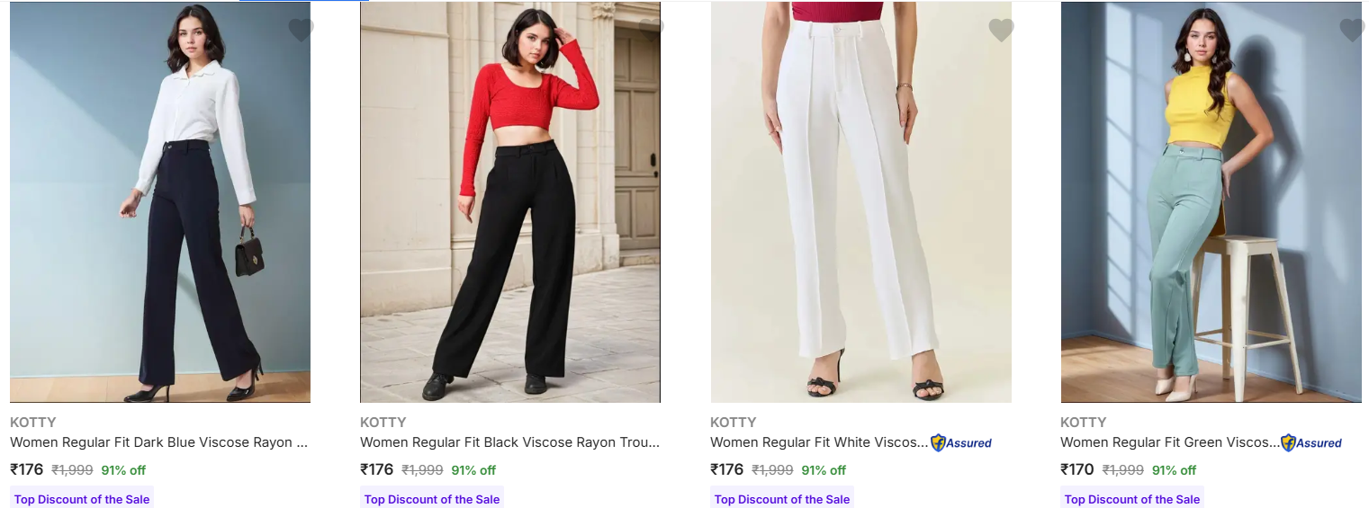 Discover an amazing offer on Kotty Women's Trousers with discounts of up to 91% off! Prices start from just ₹170 on Flipkart.