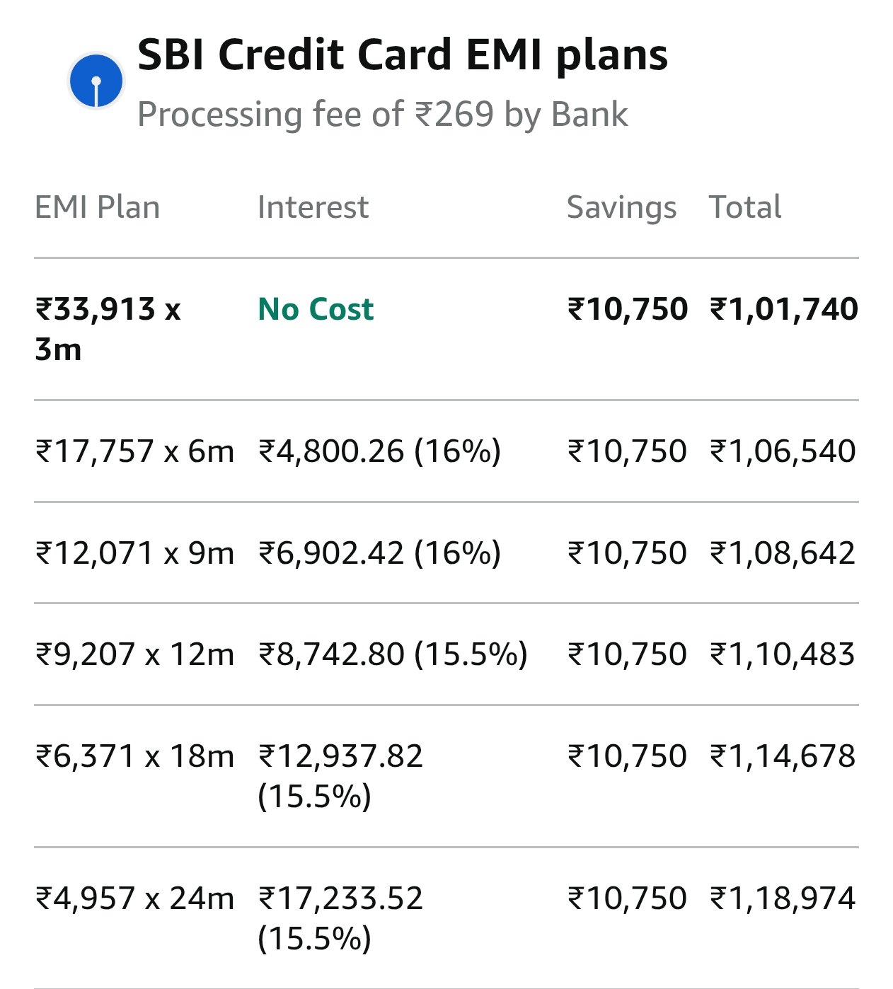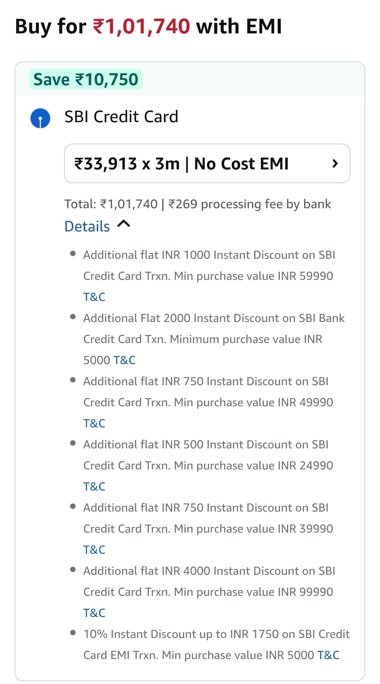 - ₹10500 instant discount with SBI Credit Card Full Payment transactions.