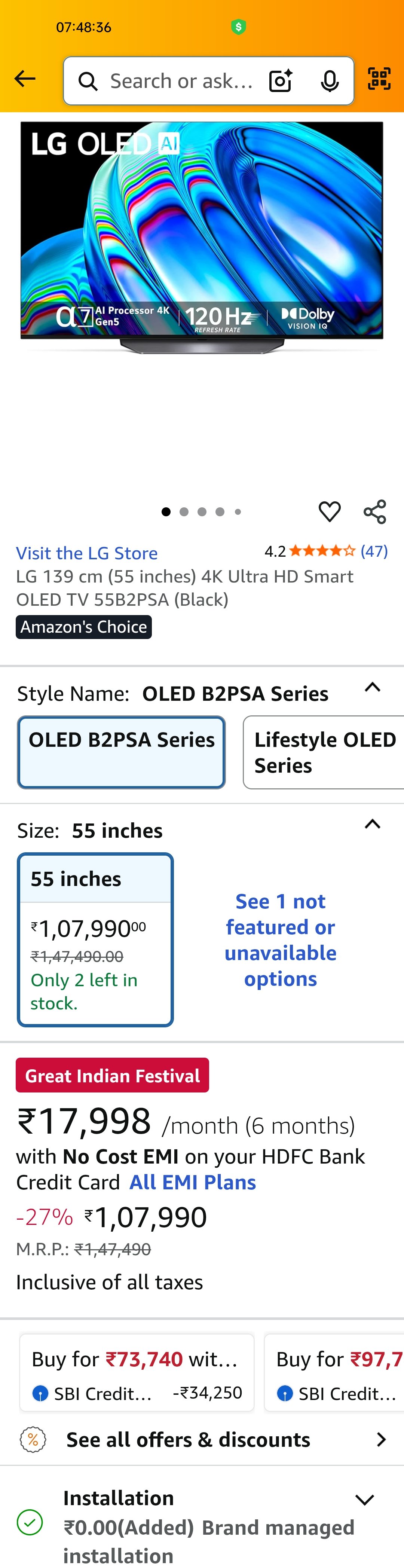 Experience stunning visuals with the LG 55-inch 4K Ultra HD Smart OLED TV (Model 55B2PSA), now available at an exceptional 50% discount on Amazon India!