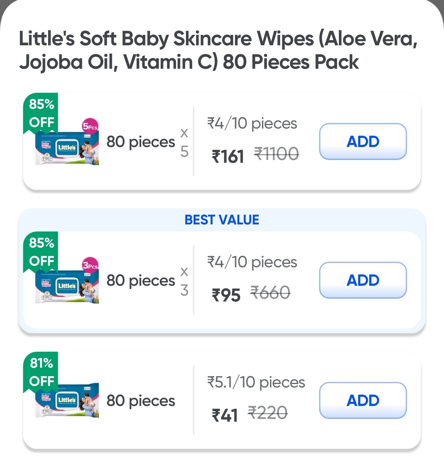 - 3 x 80 Pieces Pack: ₹660 ₹95 (85% Off)