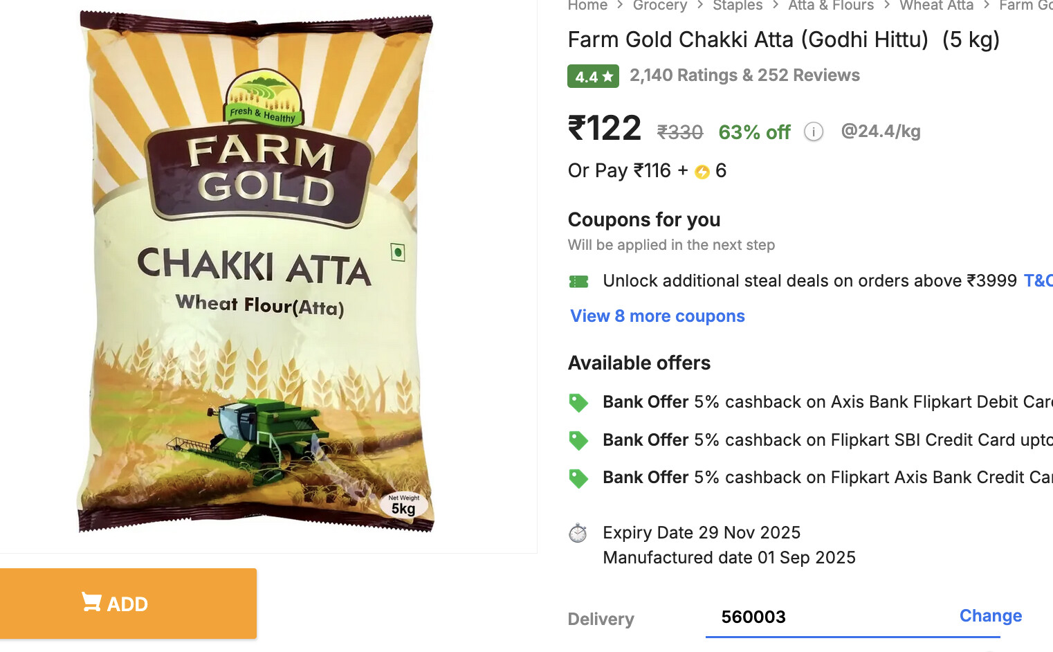 Grab the Farm Gold Chakki Atta 5 kg at an incredible 63% discount, now available for just ₹122! The retail price is ₹330.