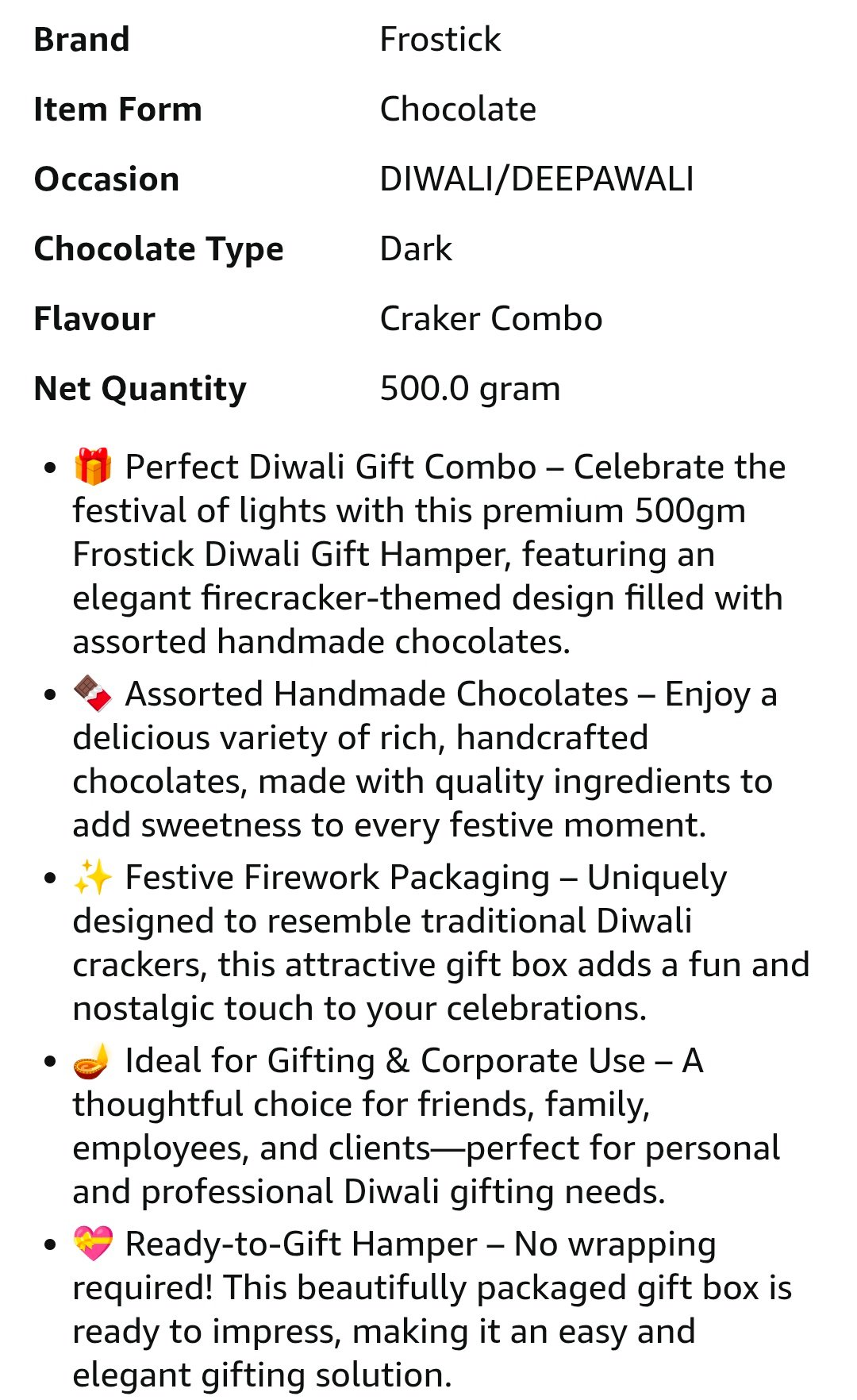 Discover an incredible price drop on the Frostick 500gm Diwali Chocolate Gift Hamper! This exquisite box features handmade, assorted firework cracker chocolates, perfect for festive gifting or a personal treat. Originally priced at ₹1449, you can now get it for just ₹87, enjoying a massive 94% discount. This is a further price reduction from its previous price of ₹97.