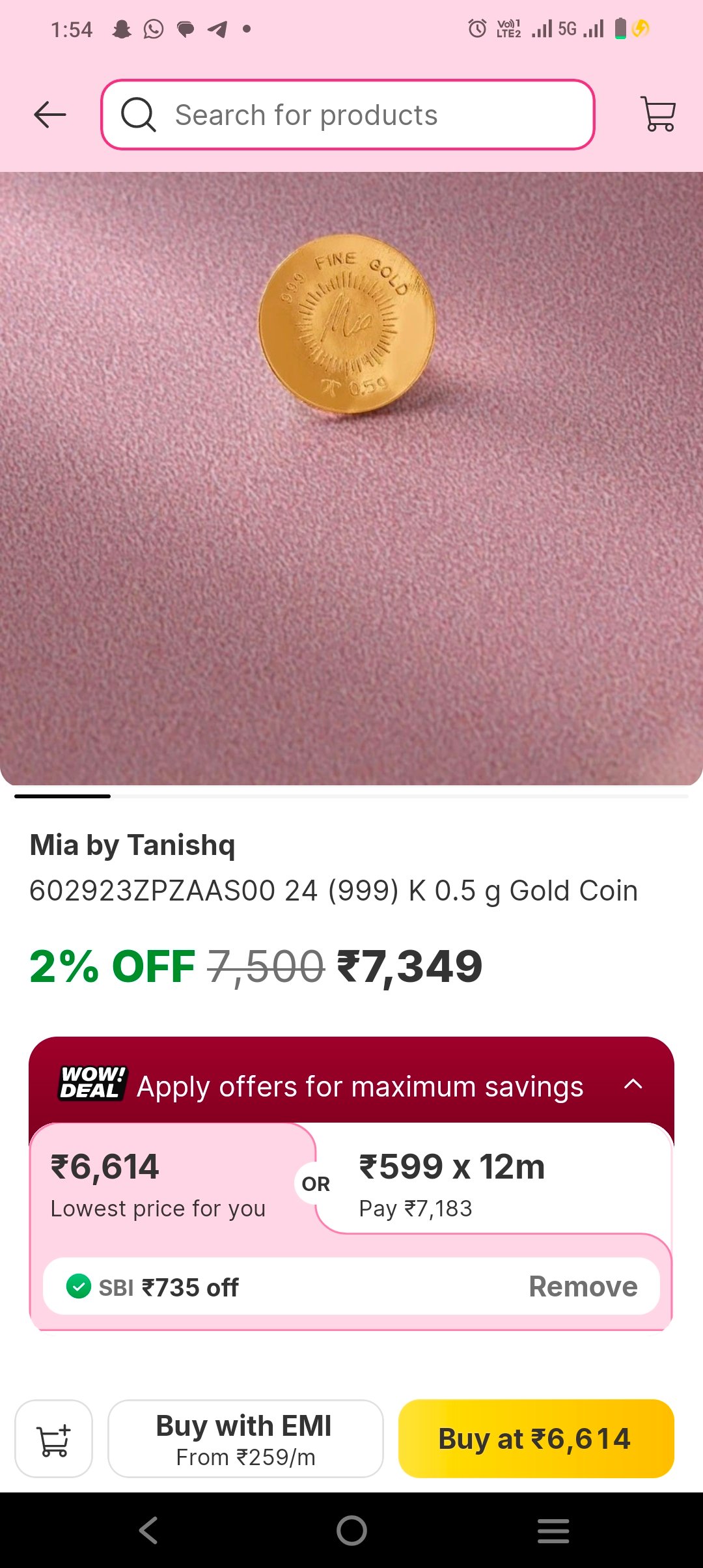 Get the Mia By Tanishq 0.5 gm Gold Coin at a discounted price of ₹6614 on Flipkart, originally priced at ₹7500. Enjoy a 12% discount on this elegant gold coin. This deal is particularly attractive for Delhi users.