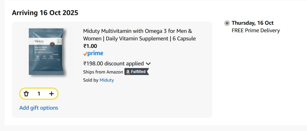 Discover the Miduty Multivitamin with Omega 3, a daily vitamin supplement for both men and women, now available at an incredible discount! This compact 6-capsule pack is perfect for trying out or for short-term nutritional support. Improve your overall well-being with this essential supplement.