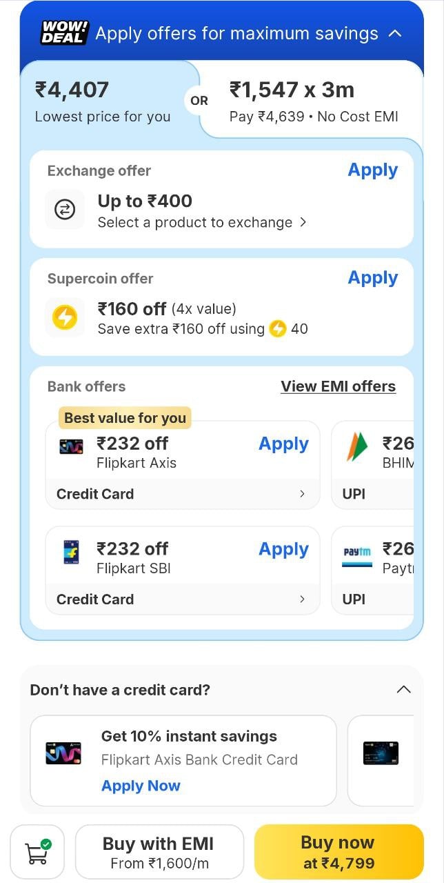 - Flipkart Supercoins Offer: Apply 40 Supercoins for an additional ₹160 discount.