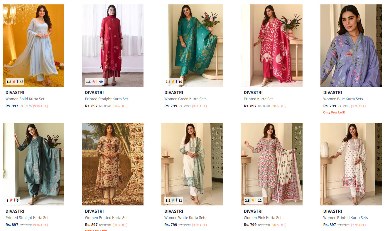 Discover stylish Divastri Kurta with Pant Sets on Myntra, now available with up to 90% off. Refresh your ethnic wardrobe with these amazing deals!