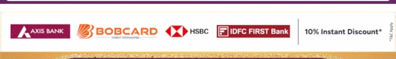 Get a 10% Instant Discount with Axis, Bank of Baroda, HSBC, and IDFC First Bank Credit Cards.