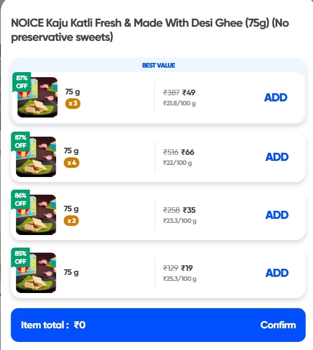 Grab NOICE Fresh Kaju Katli (No Preservatives) for just ₹19, an incredible 85% off its retail price of ₹129!