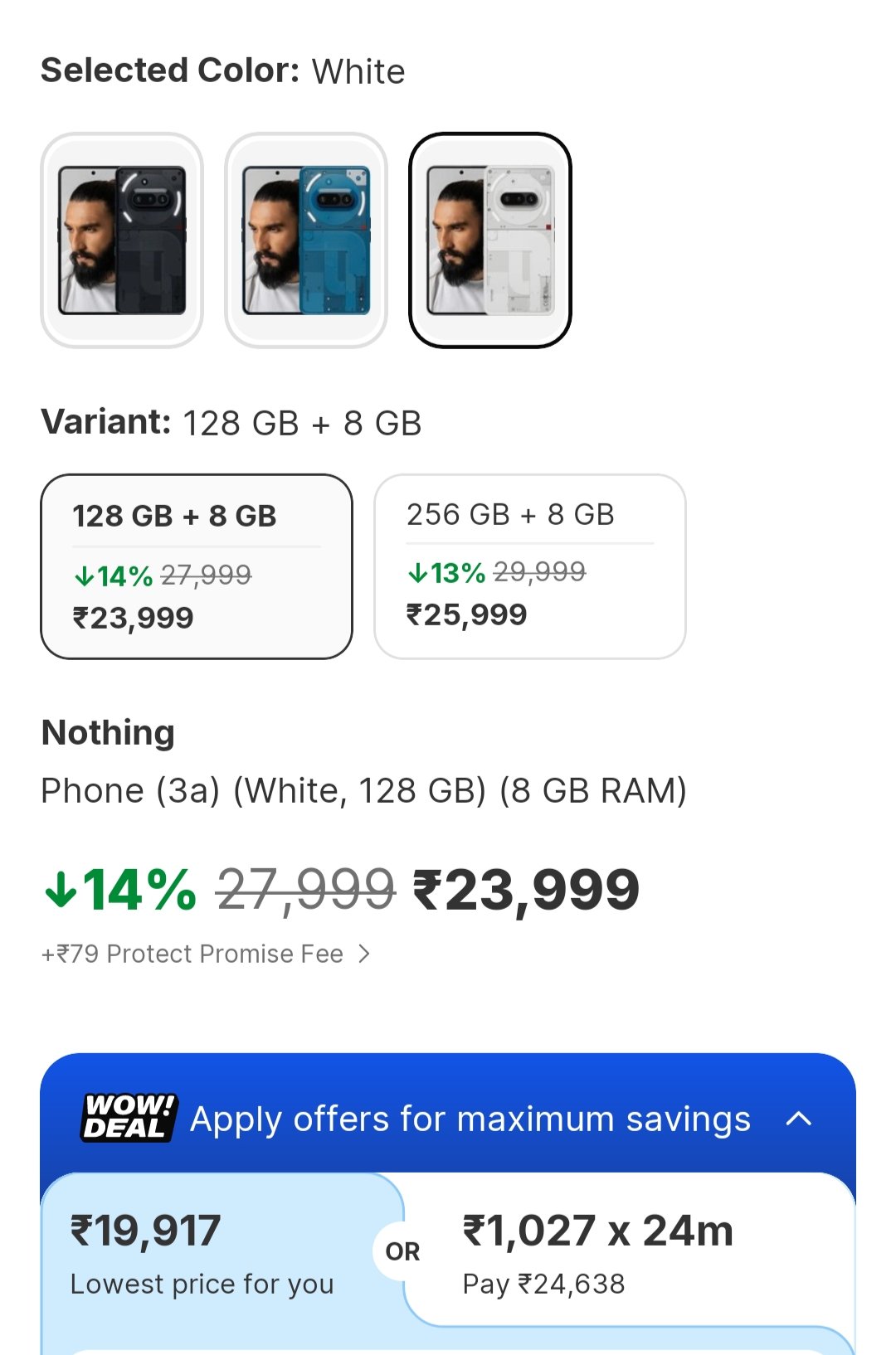 Get the Nothing Phone 3a with 8GB RAM and 128GB storage at a significant discount! This sleek smartphone, originally priced at ₹27,999, is now available for just ₹19,917, saving you 29%. Experience seamless performance and ample storage with this amazing offer.
