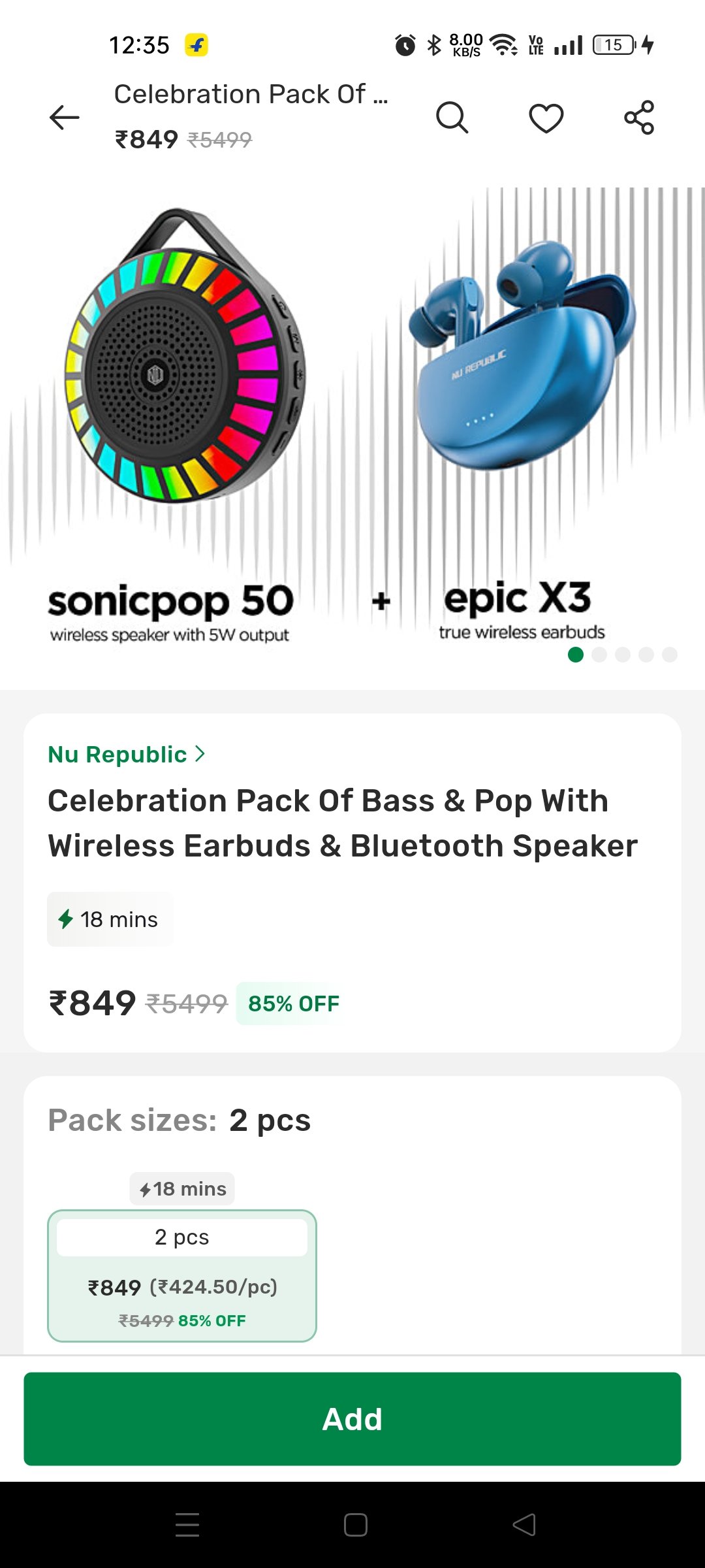 Get the Nu Republic Celebration Pack featuring Wireless Earbuds and a Bluetooth Speaker at an incredible price of ₹849 on Bigbasket. This exclusive pack offers an astounding 85% discount from its retail price of ₹5499. Elevate your audio experience with premium sound quality and seamless connectivity.