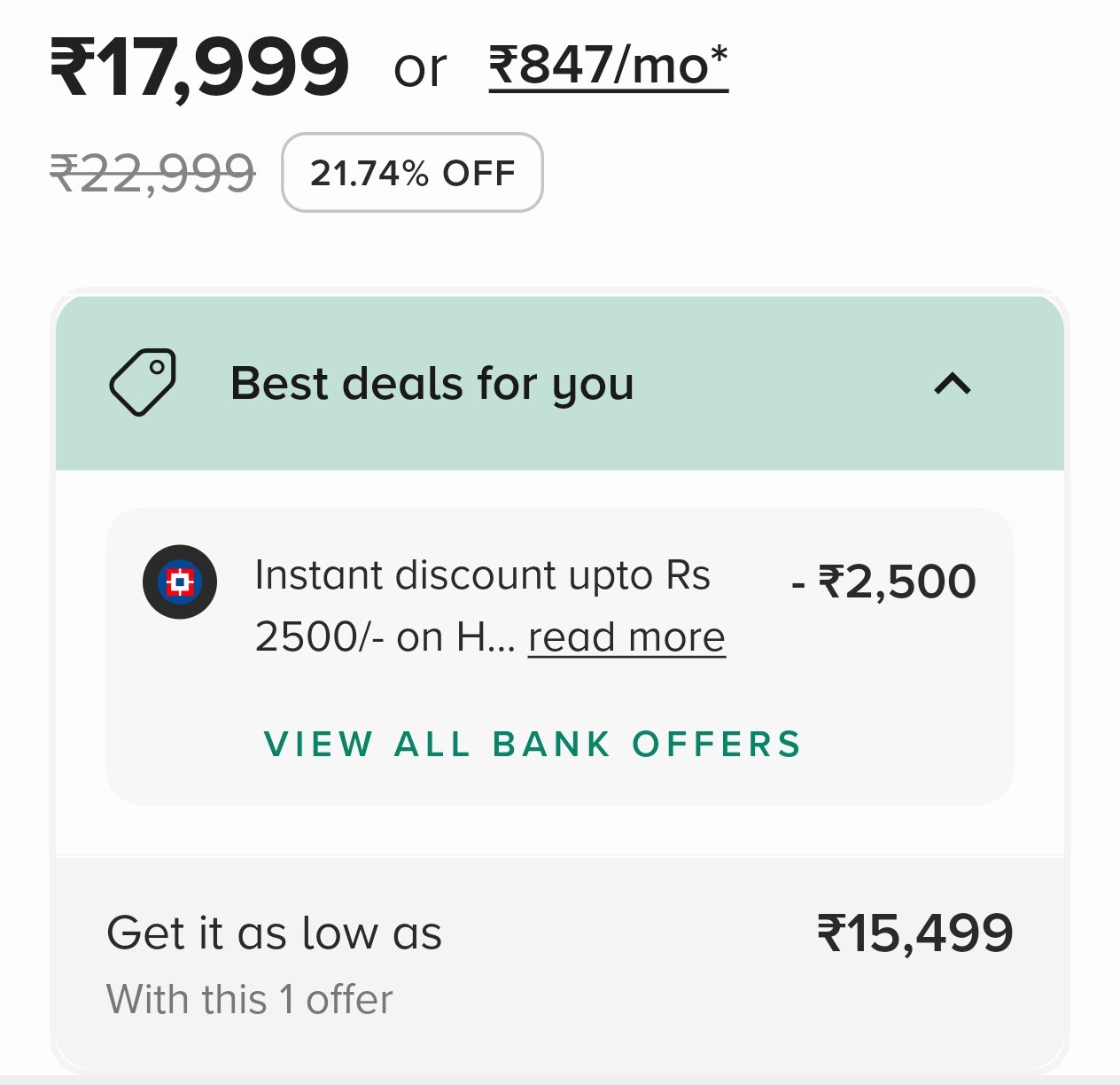 - Apply ₹2,500 instant discount with HDFC/IDFC/SBI Bank Credit Card transactions, bringing the price to ₹15,499.