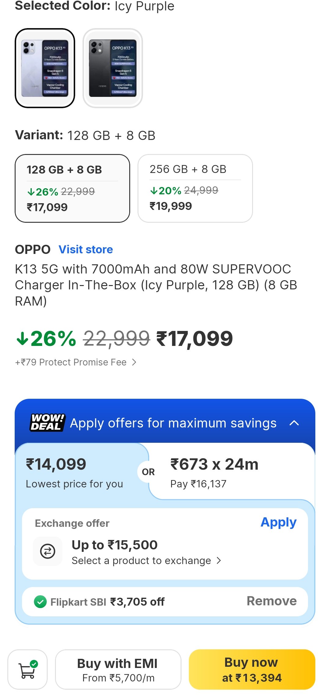 OPPO K13 5G (8GB RAM, 128GB Storage) with 80W SUPERVOOC Charger at ₹14,249