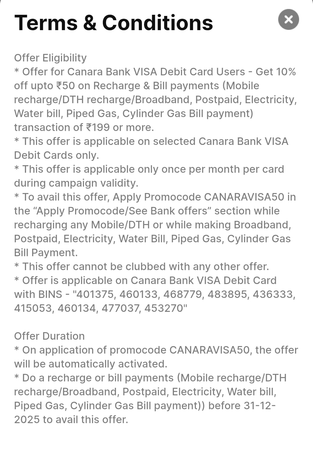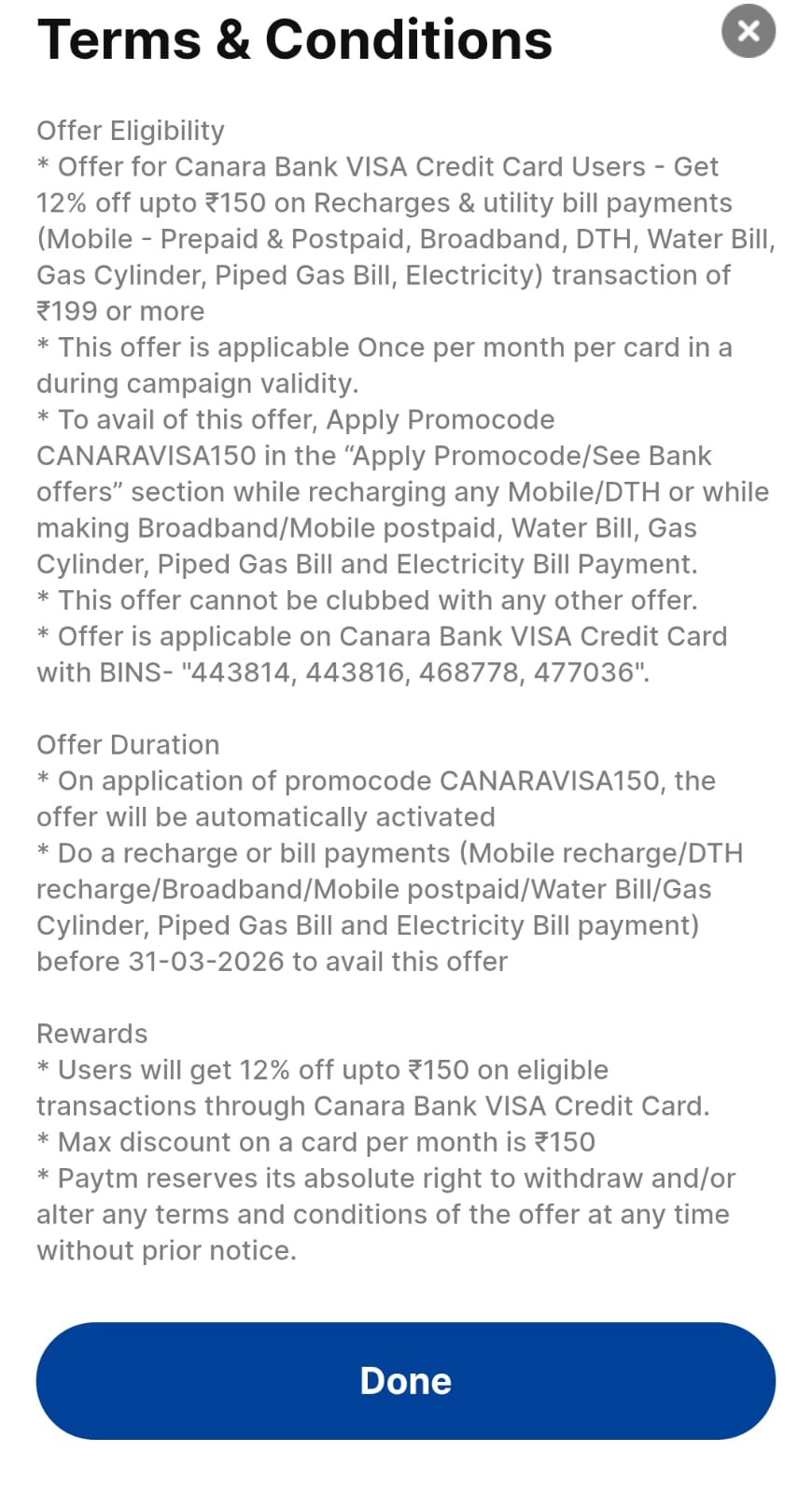 Avail exciting discounts on your Paytm recharges and utility bill payments when using your Canara Bank VISA Debit or Credit Cards. Enjoy significant savings on Mobile recharges (Prepaid & Postpaid), DTH, Broadband, Water, Gas (Cylinder & Piped), and Electricity bill payments.