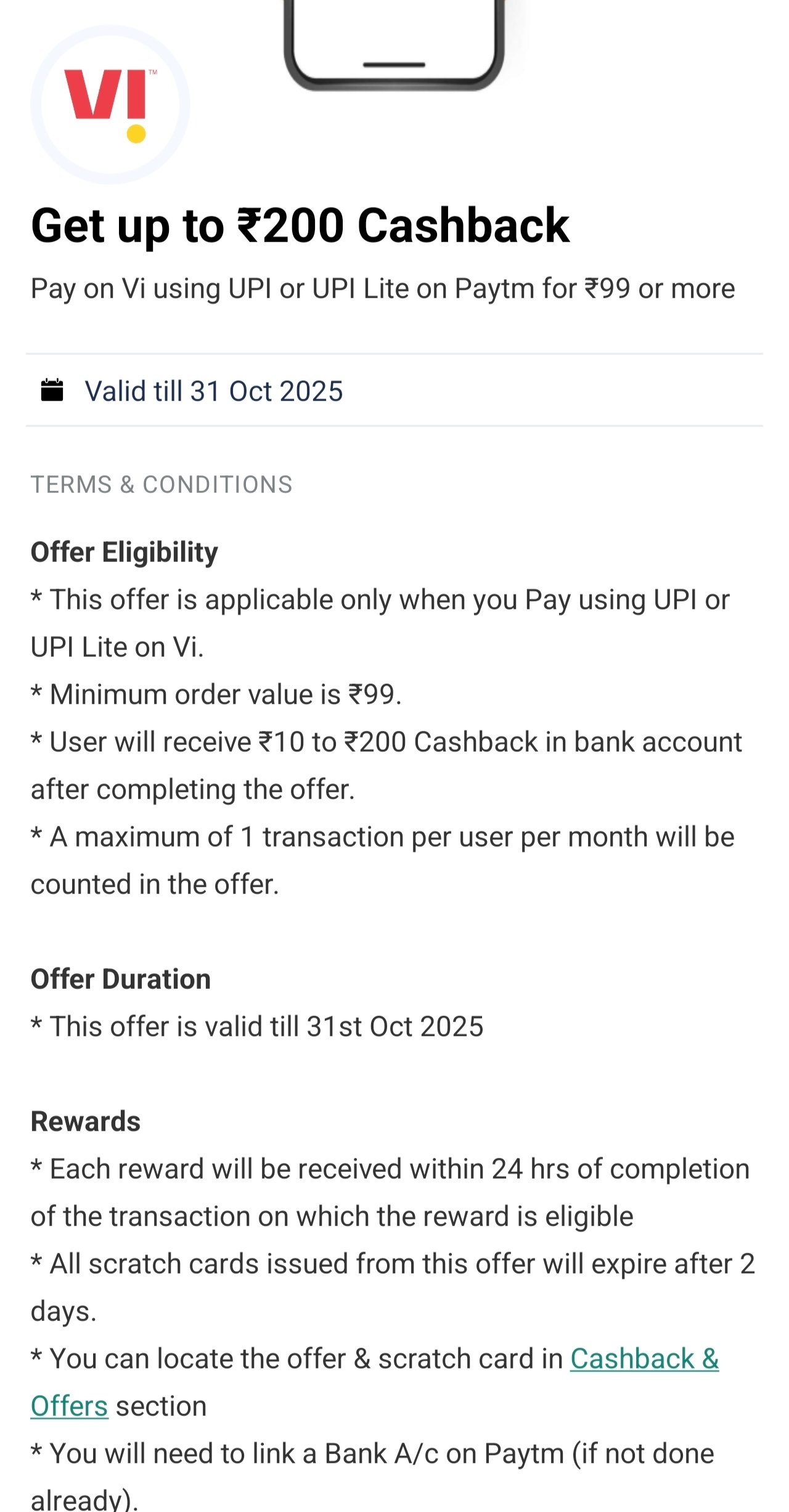 How to Avail:- Open the Paytm app and check the Vi offer in your Cashback section.