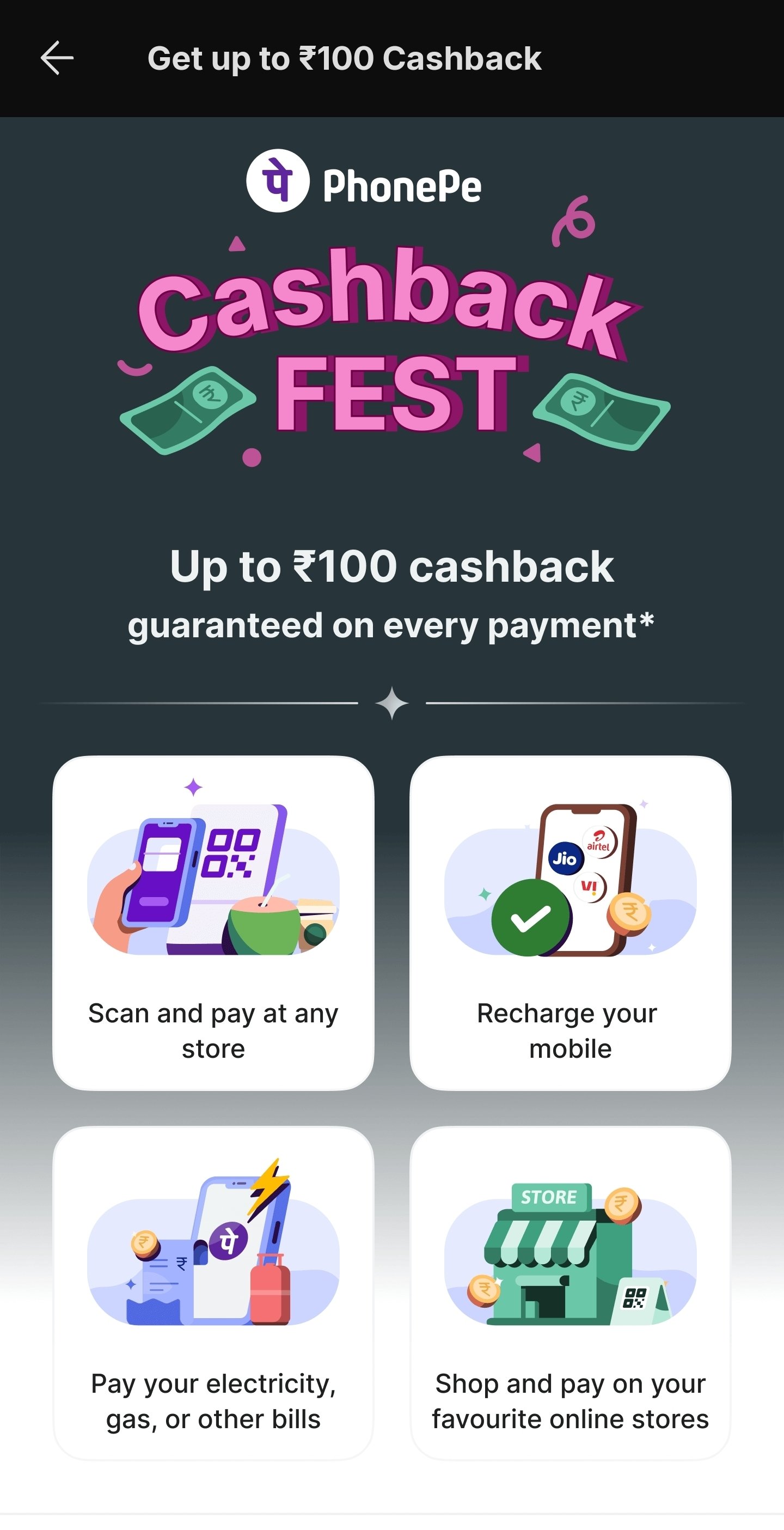 Participate in the PhonePe Cashback Fest and earn up to ₹100 cashback on your eligible transactions! Make payments of ₹11 or more and get rewarded with a scratch card.