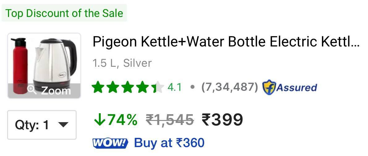Grab the Pigeon 1.5L Electric Kettle with a complimentary water bottle at a massive 74% discount on Flipkart!