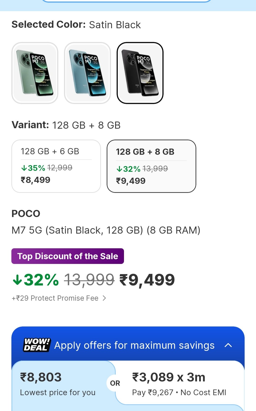 Grab the powerful POCO M7 5G with 8GB RAM and 128GB internal storage for an unbeatable price of ₹8803 on Flipkart. This deal offers a massive 37% discount from its original retail price of ₹13999, making it one of the lowest prices ever.