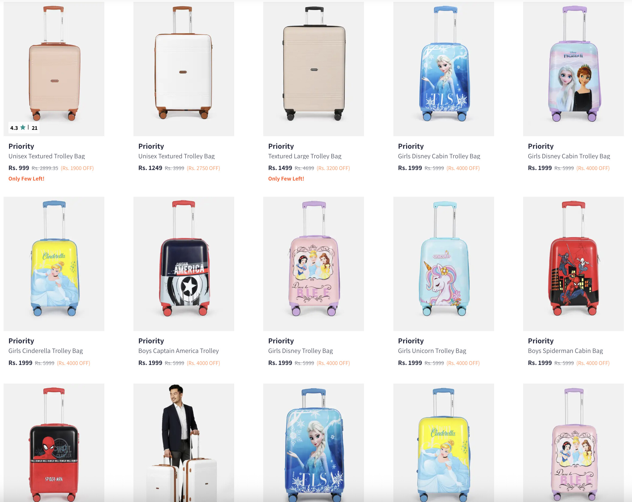 Grab a fantastic deal on Priority Trolley Bags at Myntra! Enjoy up to 66% off on a wide range of luggage, perfect for your next trip. Prices start from just ₹999. Upgrade your travel gear with durable and stylish options.