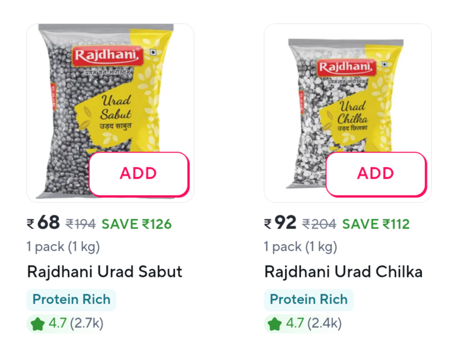 Discover amazing deals on Rajdhani Urad Sabut, Urad Chilka, Atta, and more, available for up to 65% off on Zepto! Prices start from ₹68 for Rajdhani Urad Sabut 1kg (original retail ₹194). This is a location-specific offer, with availability and exact pricing varying by pincode.