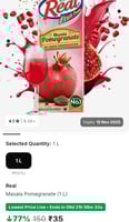 Enjoy the refreshing taste of Real Masala Pomegranate Juice. Get a significant 77% discount on the 1-liter pack.