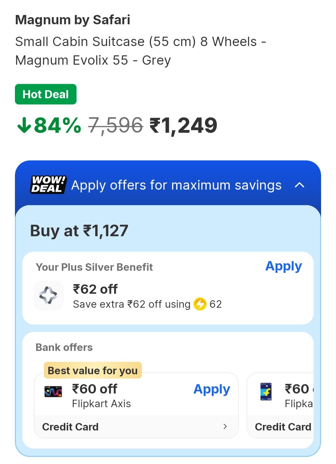 Grab the SAFARI Magnum Evolix 55cm Hard Body Cabin Suitcase in Grey at an incredible 85% discount! Ideal for your travel needs, this durable suitcase features 8 smooth-rolling wheels for effortless movement and enhanced stability. Don't miss this limited-time offer on Flipkart!