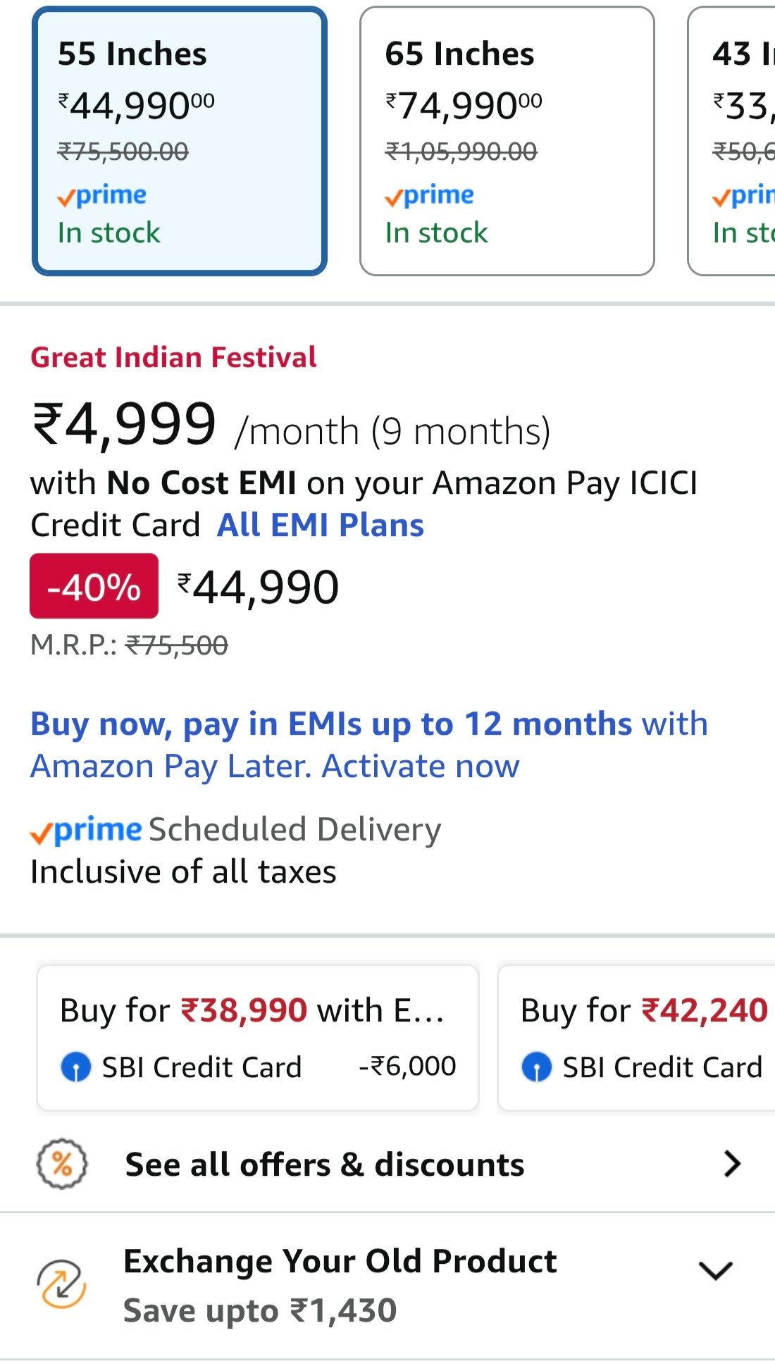 Experience stunning visuals with the Samsung 55-inch Vision AI 4K Smart QLED TV, now available for just ₹38,990. This incredible offer provides a 48% discount off the retail price of ₹75,500. Additionally, SBI Card holders can avail a flat ₹6,000 instant discount.