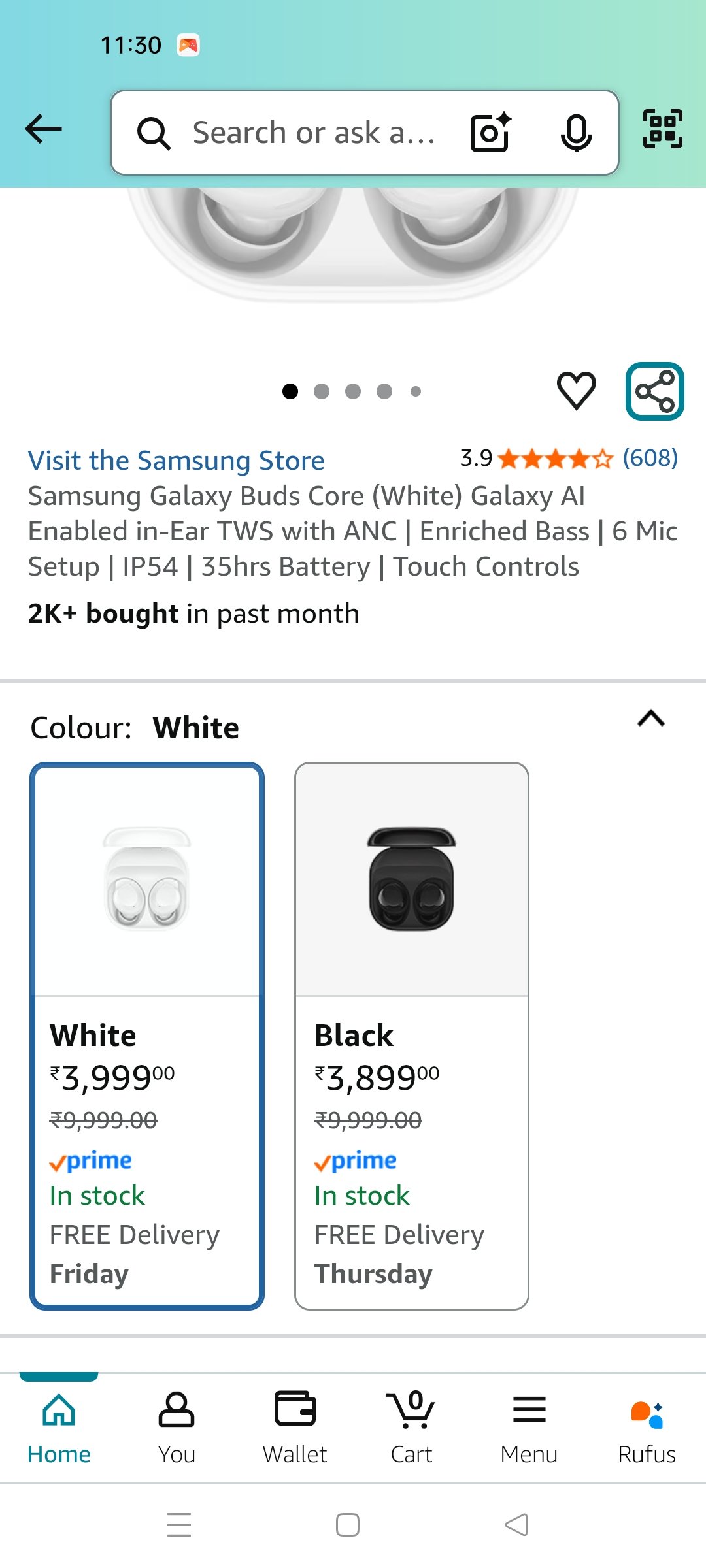 Get the Samsung Galaxy Buds Core (White) AI TWS at an incredible price! Enjoy advanced features and superior audio quality. Originally priced at ₹9999, grab them for just ₹2999, which is a massive 70% off! Plus, apply an additional ₹1000 coupon on the product page to bring the final effective price down to an amazing ₹1999!