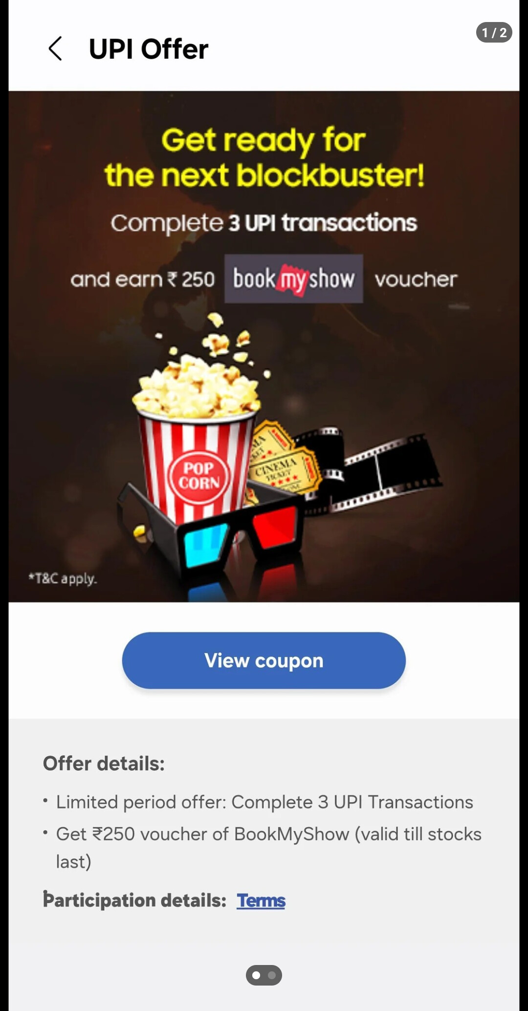 Get a ₹250 BookMyShow Voucher when you complete 3 UPI transactions using Samsung Wallet.