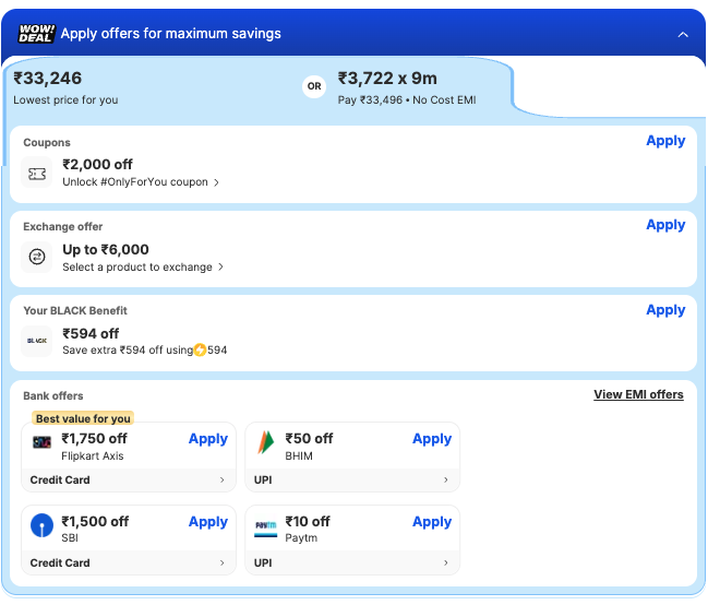 - Additional bank offers: 10% off up to ₹1,500 on BOBCARD EMI and HSBC Credit Card EMI Transactions (Min Txn Value: ₹5,000 / ₹4,990 respectively).
