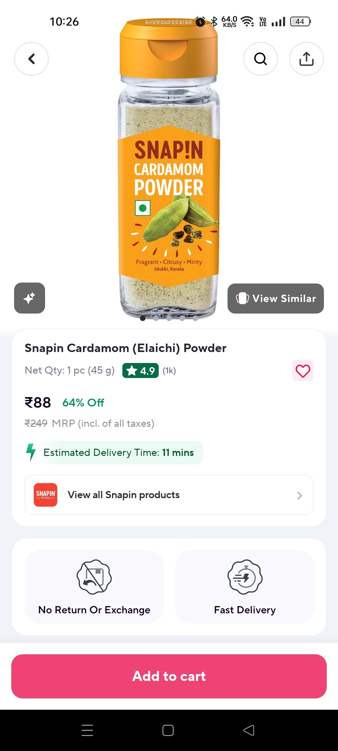 Discover the Snapin Cardamom (Elaichi) Powder (45g) available at a significant 65% discount, now only ₹88 (Retail: ₹249). This special offer is location-specific for PIN code 625009 and can be availed on Zepto.