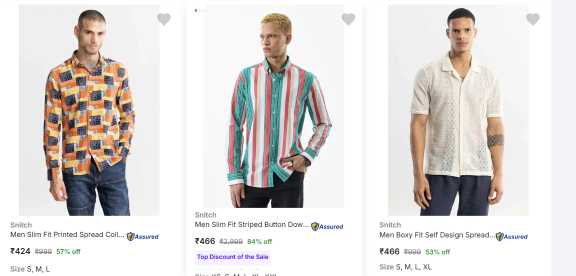 Discover amazing savings on Snitch Men's Shirts with discounts up to 84% off!