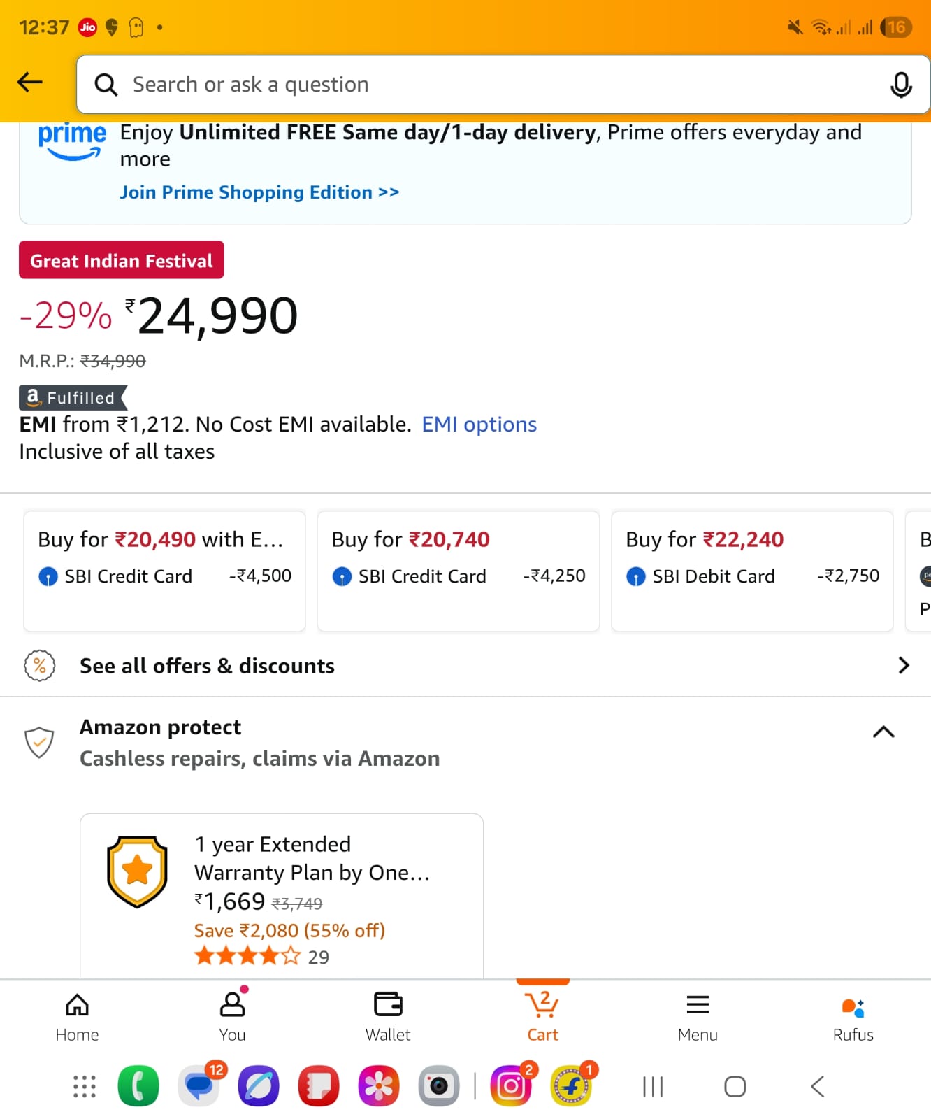 - Additional Flat ₹500 Instant Discount on SBI Credit Card Transactions (Min. purchase ₹24990).