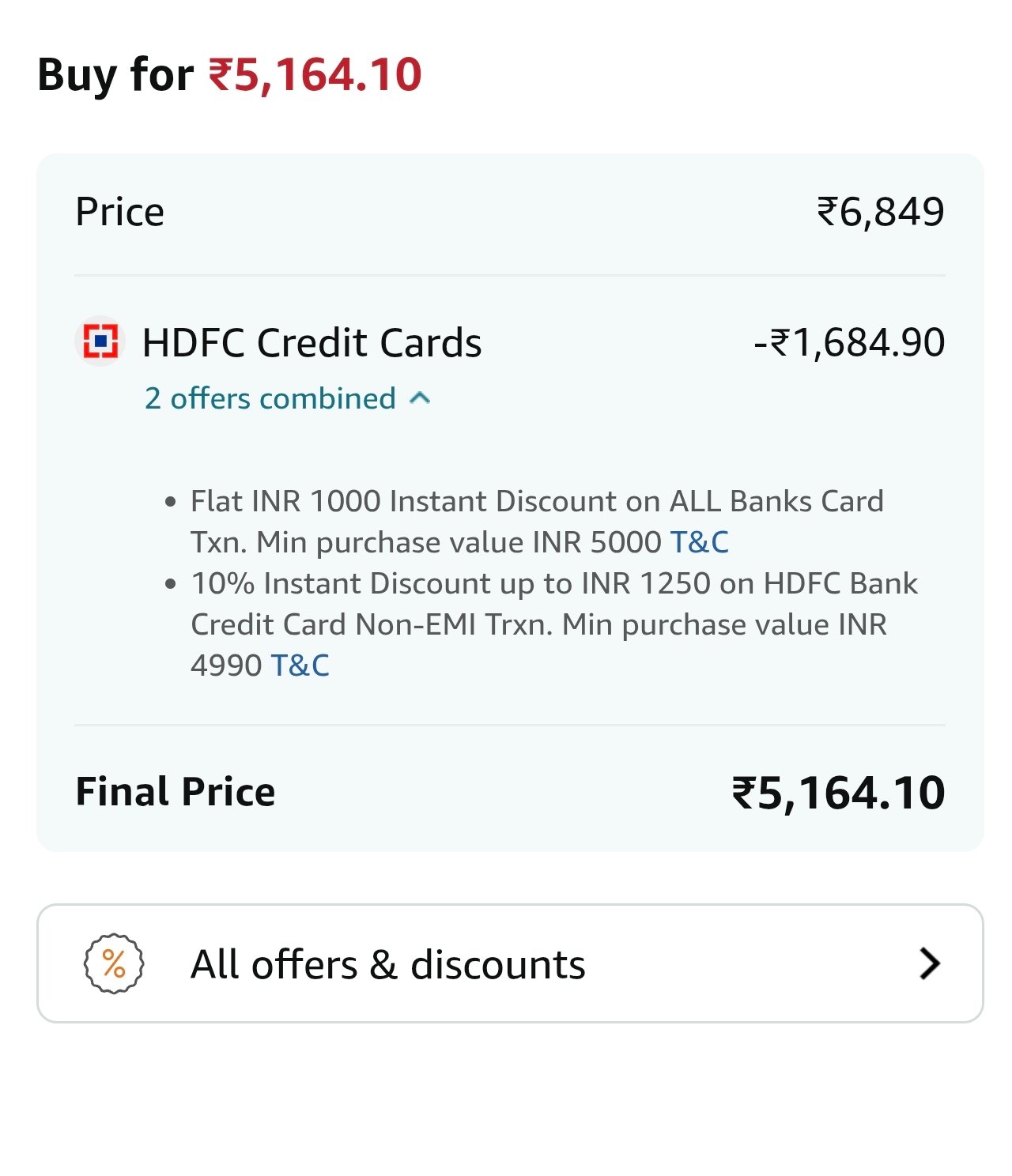- Instant Discount of ₹1684.90 using HDFC Bank Credit Cards.