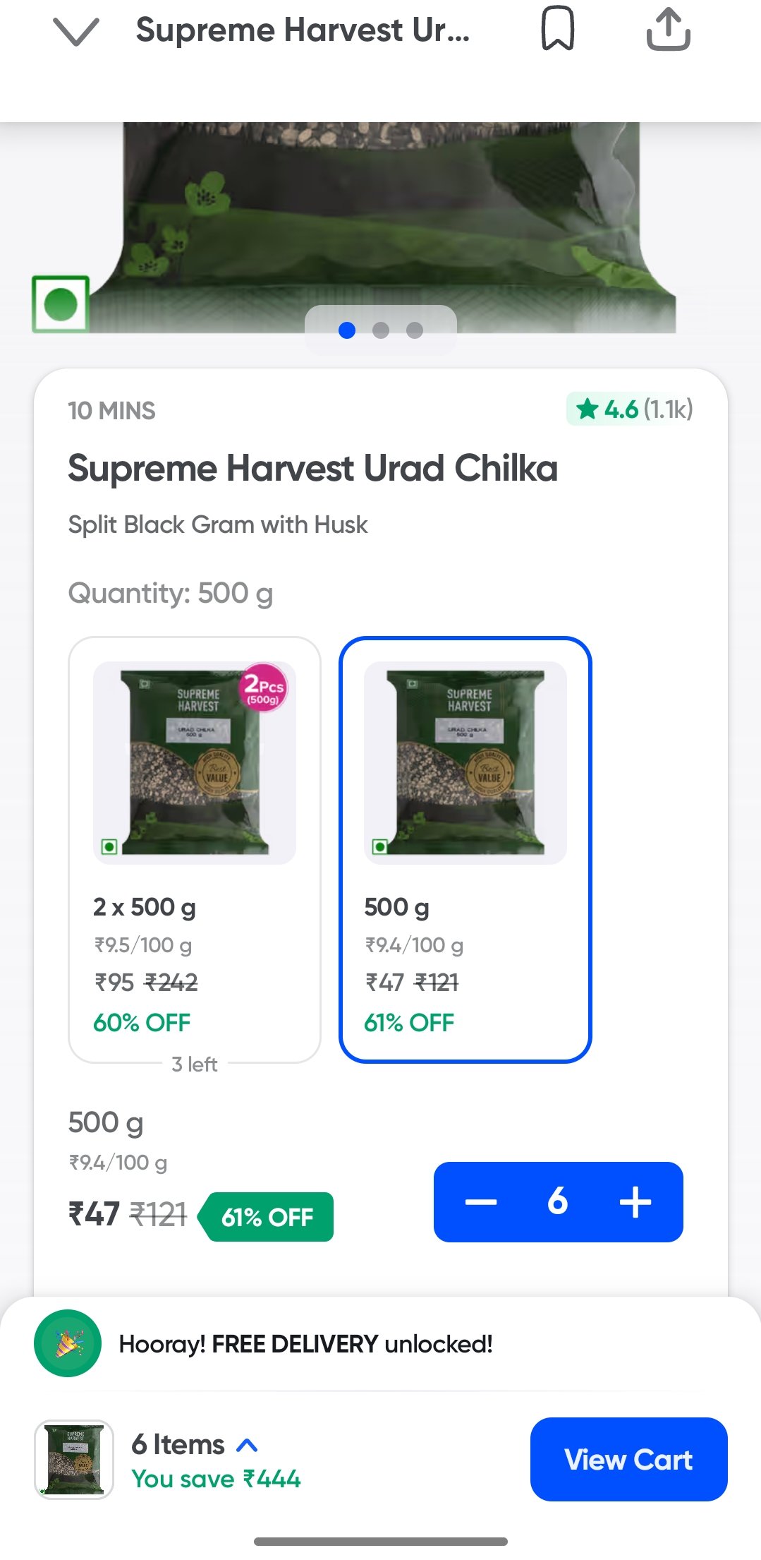 Stock up on this pantry essential for just ₹47, originally priced at ₹121. This special offer is available in Hyderabad (PIN: 500049) with a limit of 6 quantities per order.