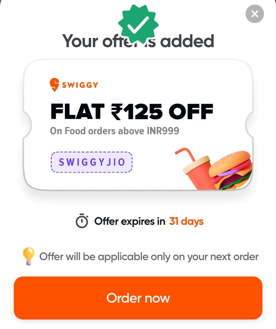 Enjoy a flat ₹125 discount on your Swiggy food orders when your cart value is ₹999 or more.