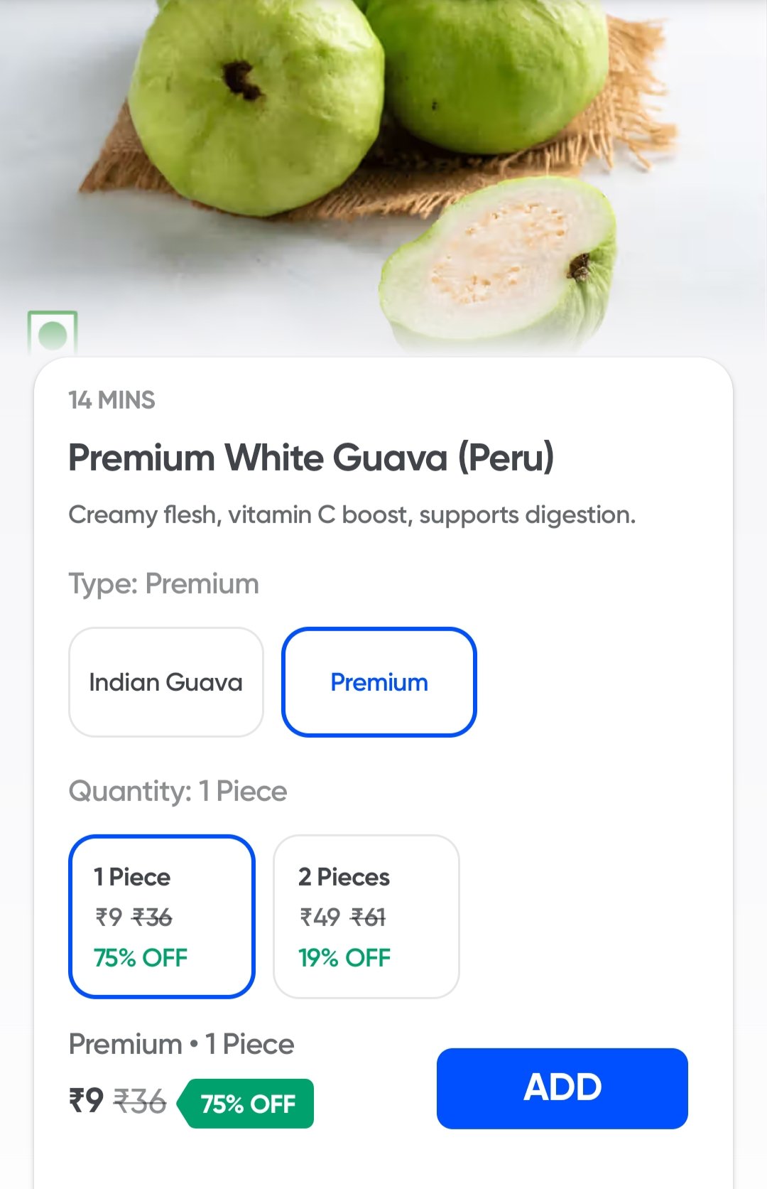 Grab a fresh Guava (Peru) for an unbelievable price of just ₹9 on Swiggy Instamart. Don't miss this limited-time offer on fresh produce!