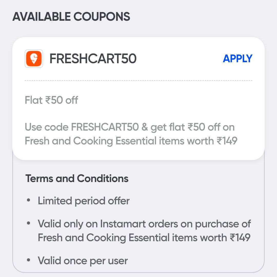 Avail a special discount of ₹50 on your Swiggy Instamart order of fresh and cooking essentials. This offer is valid on a minimum order value of ₹149.