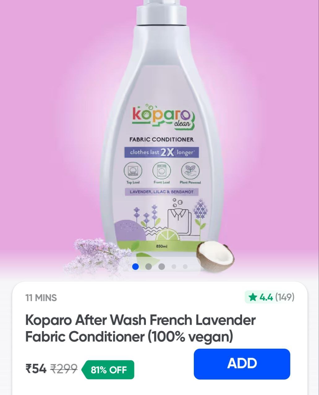 Discover a fantastic deal on Koparo After Wash French Lavender Fabric Conditioner 850ml, available on Swiggy Instamart for a limited time!