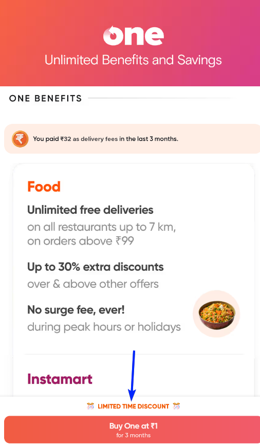 Unlock a 3-month Swiggy One Membership for just ₹1! This exclusive offer is available to Swiggy accounts that have not purchased Swiggy One or Swiggy One Lite in the past three months.