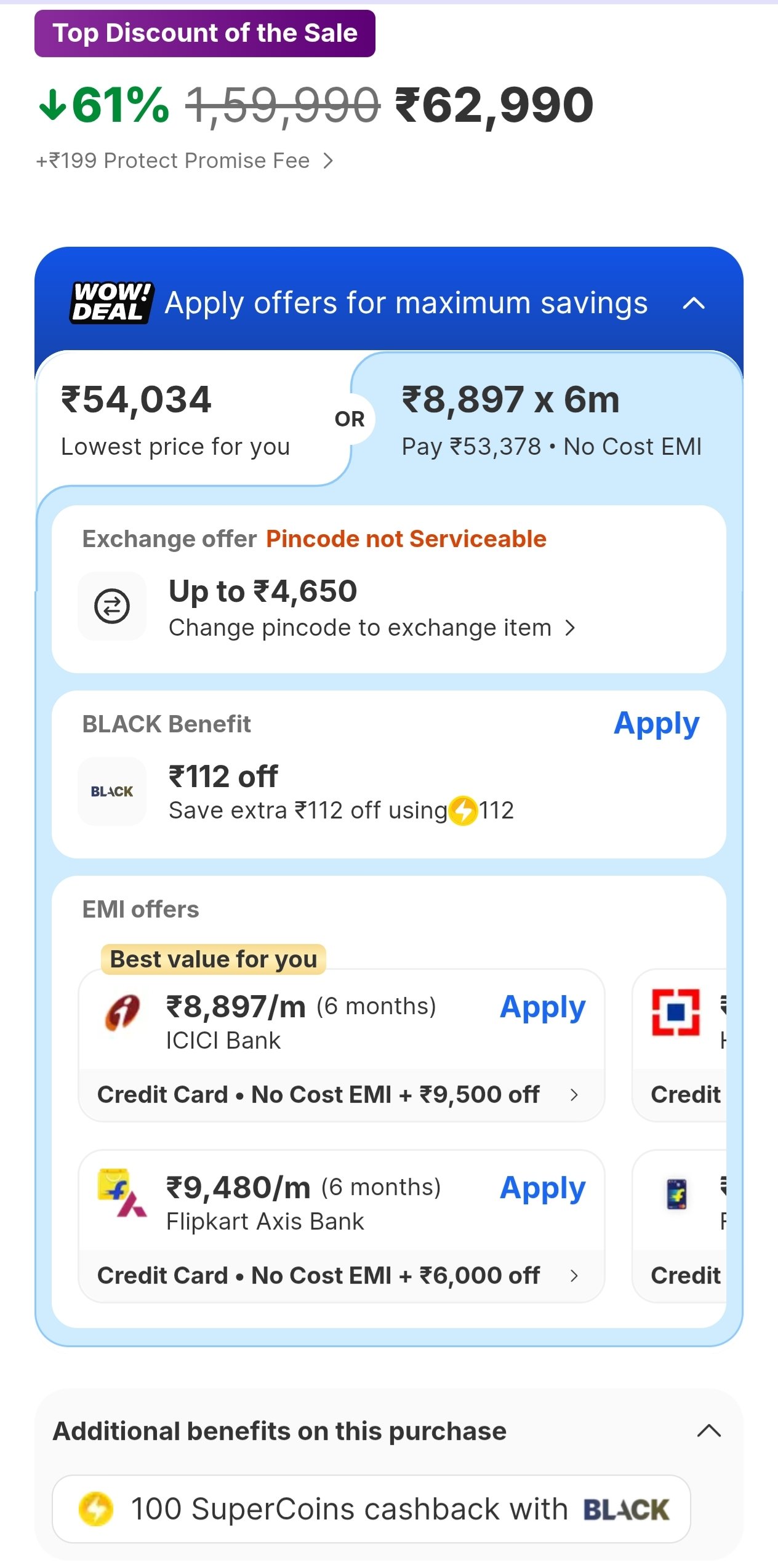 - Flipkart Axis Bank Credit Card (Full Payment): Up to ₹8,444 off (₹3,000 off + ₹3,000 off + 5% cashback)