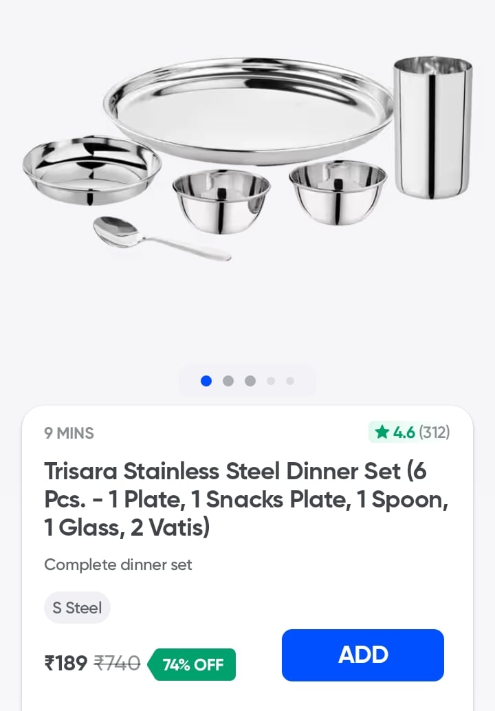 Grab the Trisara 6-Piece Stainless Steel Dinner Set for an incredible price of ₹189 (74% off) exclusively on Swiggy Instamart!